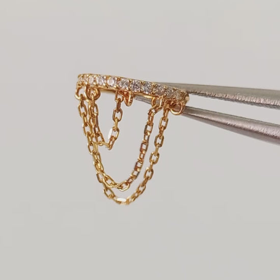 Joya en oro solido de 14k, Hermosa argolla con cristales clear lateral y conjunto de tres cadenas, ideal para perforaciones de septum, helix, lobulo.