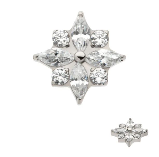 Esta joya está fabricada en titanio grado implante ASTM F-136, el material más recomendado para perforaciones iniciales y pieles sensibles. Su diseño de flor con cuatro pétalos grandes y otros cuatro mas pequeños aporta elegancia, brillo y una sensación de lujo en cualquier estilo.