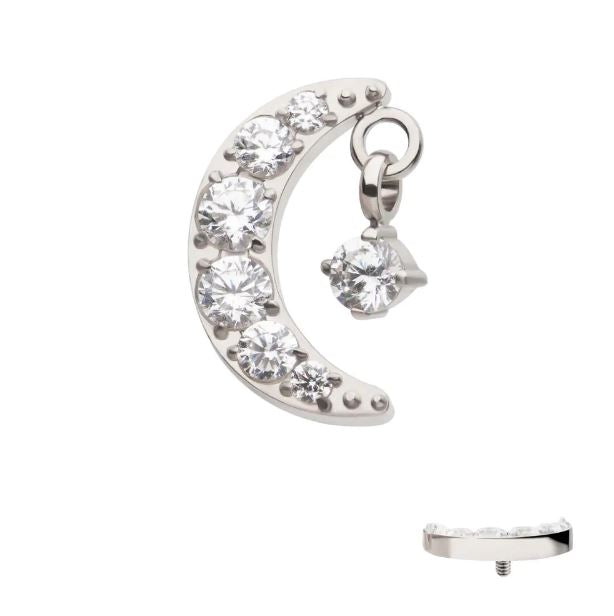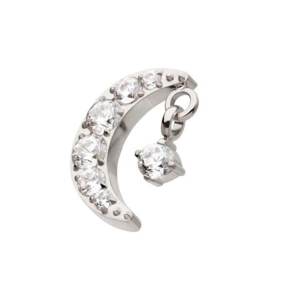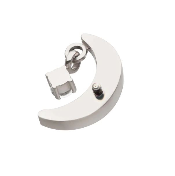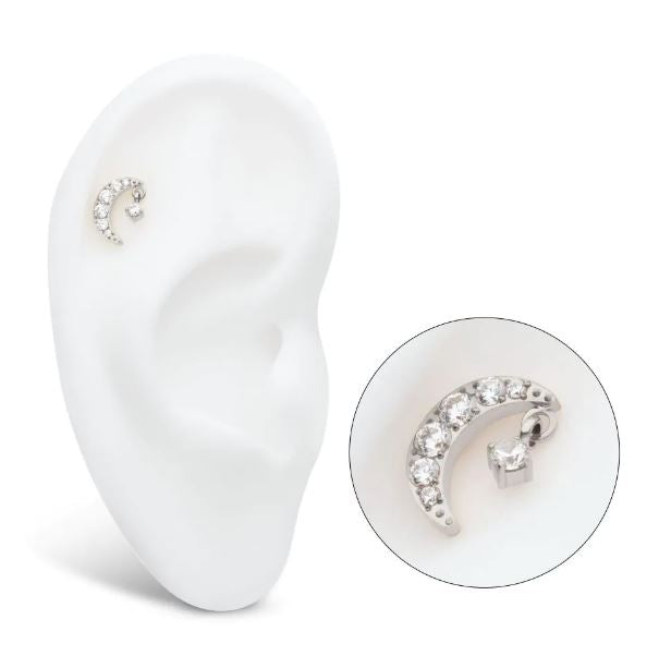 Esta joya está fabricada en titanio grado implante ASTM F-136, el material más recomendado para perforaciones iniciales y pieles sensibles. Su diseño Luna con un colgante aporta elegancia, brillo y una sensación de lujo en cualquier estilo.